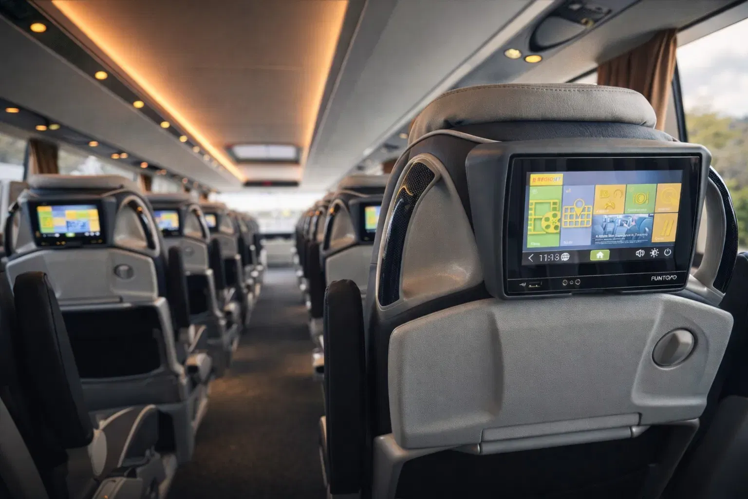 A járművek szinte ugyanazt a komfortszintet kínálják, mint a nemzetköziben közlekedő társaik, minden ülés rendelkezik háttámlába épített, egyéni kijelzővel ellátott Funtoro multimédiás szórakoztató rendszerrel, USB- és USB-C-csatlakozóval, 230 voltos aljzattal, valamint lehajtható lábtámasszal és asztalkával. A Setra Voyage Ambassador luxusülések mellett az utazók kényelmét Wi-Fi szolgáltatás, Frenzel FOAS hűtött üdítőautomata, hidegvíz-adagoló, valamint az üzemanyagtöltő-állomásokról is ismert WMF 1500 S+ professzionális kávéautomata is szolgálja.