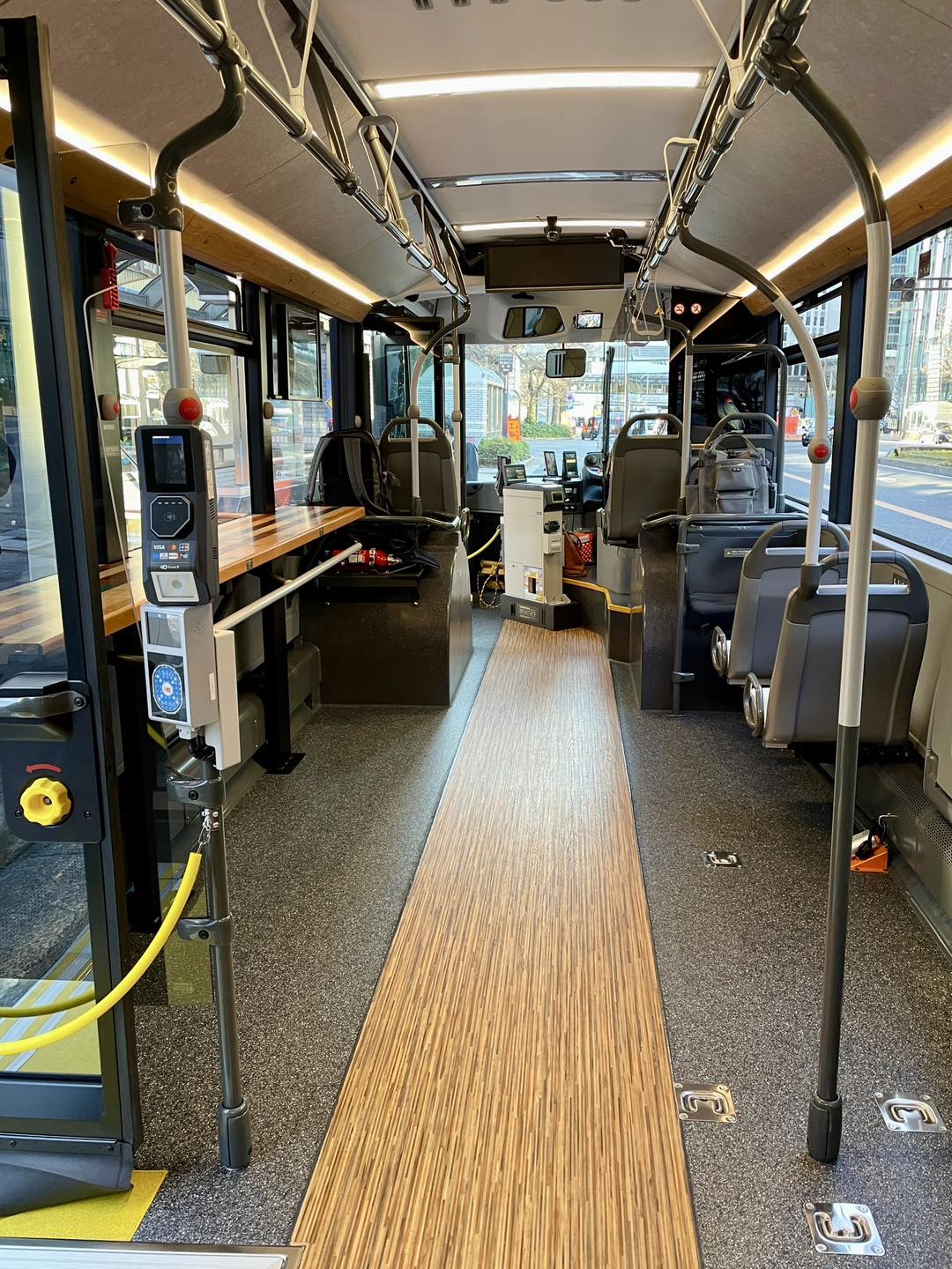 A hivatalosan 122 fős befogadóképességű, ezen belül 35 ülőhelyet kínáló utastér berendezése sem mindennapi. Már önmagában a teljes hosszban alacsonypadlós (low floor) konstrukció is újdonságnak számít a szigetországban, akárcsak a hátsó kocsitestben található, egymással szembefordított négyes ülések, amelyeket itt szalonülésnek hívnak és alapvetően a vasúti utazáshoz társítanak. A padlót és a légcsatornákat részben fahatású borítással látták el, a mellső tengely mögött a baloldali peronrészen pedig egy pult is helyet kapott az álló helyzetben történő kényelmes nézelődéshez. A felszereltség része a MOOX-RIDE nevű utazási élmény-támogató rendszer is, amely az útvonal éppen érintett látnivalóiról ad valós idejű audiovizuális tájékoztatást.