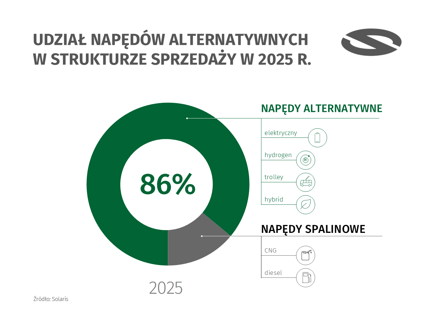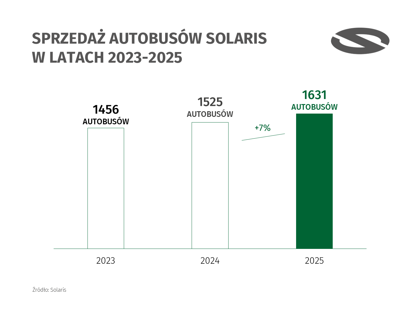 A Solaris a hivatalos beszámoló szerint 2025-ben összesen 1631 új autóbuszt adott át ügyfeleinek, ami 7%-os növekedést jelent az egy évvel korábbi eredményhez képest. Ezeket 15 különböző országban értékesítették, a legnagyobb piacaikat Lengyelország, Olaszország, Németország, Svédország, Hollandia és Svájc jelentette. Az átadásokat ezúttal is az alternatív hajtásláncú típusok pörgették: a cég csak az elmúlt évben 916 darab akkumulátoros villanybuszt és 306 darab hidrogén üzemanyagcellás hajtású járművet szállított le a megrendelőinek, mindkét mennyiség éves rekordot jelentett a lengyel buszgyártó történetében. Előbbiek esetében a legfontosabb ügyfelek a tavaly 118 új elektromos Solaris autóbuszt forgalomba állító svéd Nobina és a flottáját 97 darab Solaris Urbino 18 electric csuklós villanybusszal bővítő milánói ATM Milano voltak, de jelentős mennyiséget vett át a Transdev utrechti kirendeltsége, a szardíniai Cagliari térségében szolgáltató CTM, a berlini BVG és a svájci PostAuto is, sőt, Romániából is több üzemeltető szavazott bizalmat a Solaris villanybuszainak. A hidrogénhajtású típusok vásárlói közül két szolgáltatót, a 88 ilyen járművet beszerző bolognai TPER-t és a cseh Martin Uhert emelte ki összefoglalójában név szerint is a gyártó, amely ezen kívül számos német városba (Kerpen, Wuppertal, Köln, Gummersbach, Duisburg) is szállított ilyen járműveket az elmúlt évben. Mindezeken túl jól fogytak a Solaris trolibuszai is (ezek egy része termékpolitikai okokból Škoda emblémával került forgalomba).