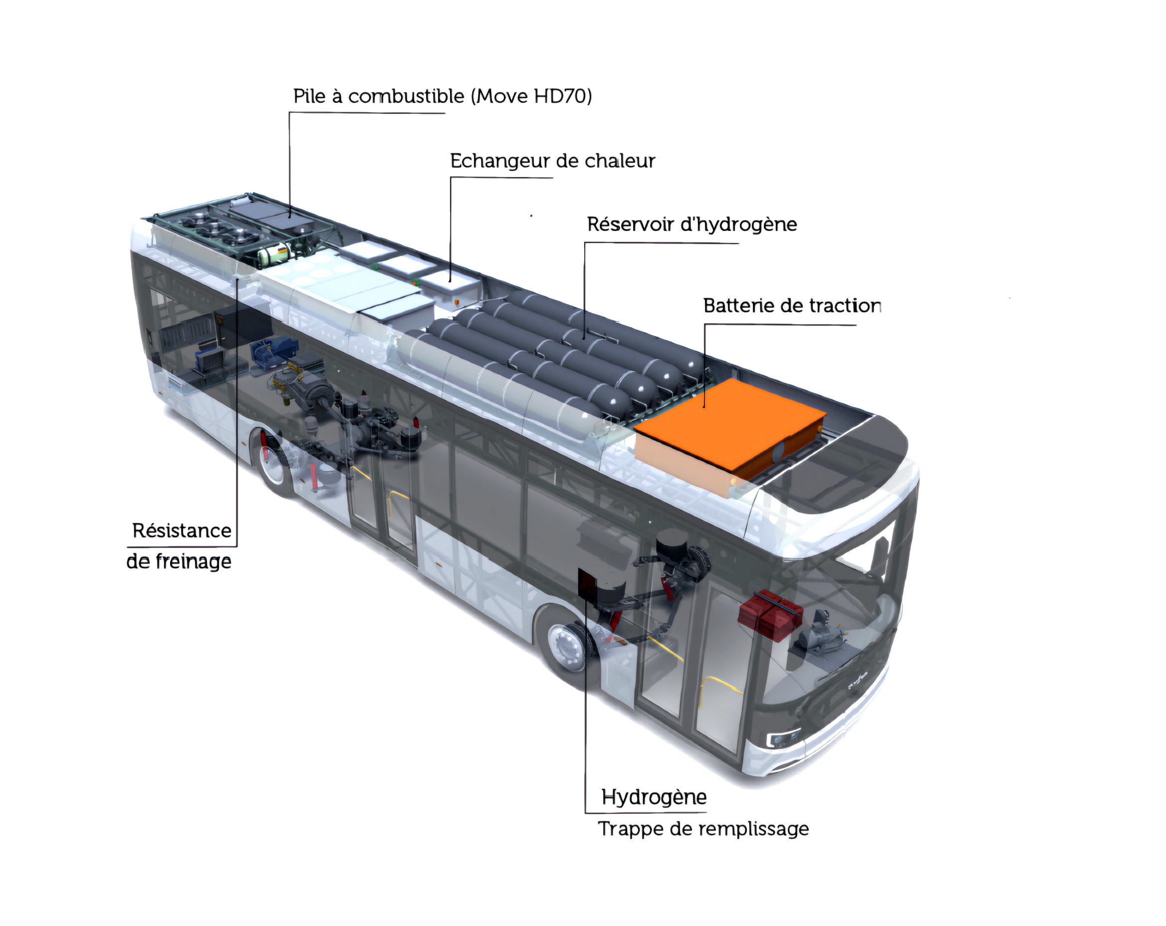 Given hydrogen’s highly reactive nature, hydrogen-powered buses are equipped with numerous hydrogen leak detectors to prevent accidents. These sensors are mandatory in any enclosed or semi-enclosed space where leaking hydrogen gas could accumulate, such as passenger and cargo areas. The onboard system sends an alert to the driver if even a small amount of hydrogen is detected in the passenger compartment, and it shuts off the main valve if the concentration exceeds 4.0% by volume, isolating the hydrogen tanks and stopping the vehicle. In the specific buses involved in the Belfort fire, one sensor is located in front of and one behind the roof-mounted hydrogen tank unit, with two more around the Ballard Power Systems fuel cell. For maximum safety, each tank is fitted with a series of safety features: leak-proof valves and thermal pressure relief devices (TPRDs). Each tank has three TPRDsâone in the middle and one at each end, with the one near the filling connector often integrated with the valve module for filling, operational emptying, and sealing. Safety valves prevent hydrogen from reaching the fuel cell in case of leaks and ensure that cells are ventilated in the event of an accident. TPRD valves release hydrogen gas vertically in a controlled manner at high temperatures (upwards for roof-mounted tanks, downwards for underfloor installations, such as those in some long-distance hydrogen buses and cars). Sensors monitor the tanks, and in case of damage, the system automatically releases the stored hydrogen into the open air.